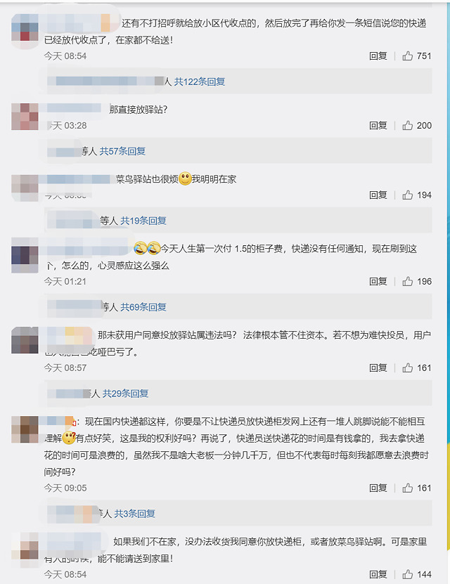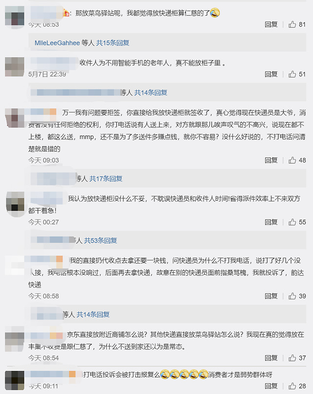 “那放菜鸟驿站呢,我都觉得放快递柜算仁慈了”