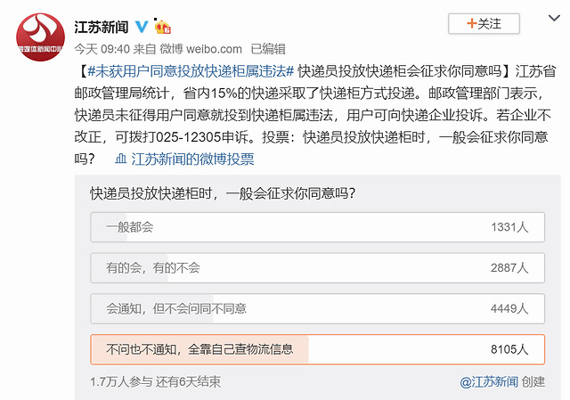 江苏新闻就此发起一项投票:超半数的人选择了“不问也不通知,全靠自己查物流信息”,剩下的按照票数从大到小依次为“会通知,但不会问同不同意”“有的会、有的不会”“一般都会”。