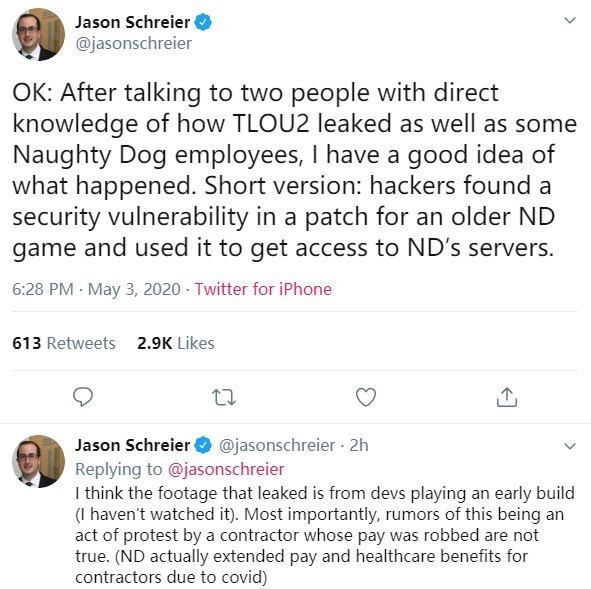 在本月2日,索尼公布了调查声明,称这次泄密和索尼自己以及顽皮狗都没有关系,而今天Kotaku记者JasonSchreier在个人Twitter上爆料了一些细节。JasonSchreier说:“在和熟知《最后生还者2》如何被外泄的两人以及一些顽皮狗员工的沟通后,终于搞清楚了这件事是怎么发生的。长话短说就是,有黑客从一个旧的顽皮狗游戏的补丁中找到了安全漏洞,然后利用这个漏洞进入了顽皮狗的服务器。我觉得泄露的视频是来自于游玩早期版本的开发者。”当然,由于最终的调查结果还没有出来,所以事件仍然迷雾重重。