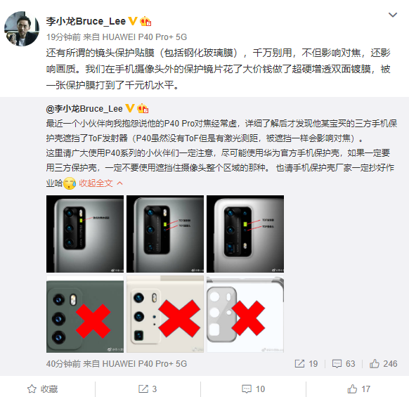李小龙贴心地标出了P40激光发射器、P40 Pro ToF发射器/镜头的详细位置,并提醒用户尽可能使用官方保护壳。如果一定要选购三方壳,也千万注意不要使用会遮挡摄像头部分区域的那种,最好将方形模组全部露出。