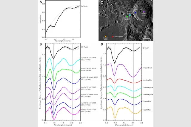 着陆月球背面一年多以来,嫦娥四号的红外光谱仪、降落相机、地形地貌相机、全景相机等科学载荷发现了着陆巡视区内多种岩石类型,包括苏长斜长岩、苏长岩和辉长岩等。此前,月兔2号月球车发现了一堆碎石块,并对其中的一块岩石(“奇缘”)进行了光谱探测。这是人类首次获得月表岩石的可见光-近红外反射光谱。团队成员进行了详细的光谱分析,并对比美国阿波罗样品光谱特征,发现其是由主要矿物斜长石和辉石,次要矿物橄榄石(含量小于4%)组成的苏长岩。研究结果对月球地质学的研究具有重要意义。