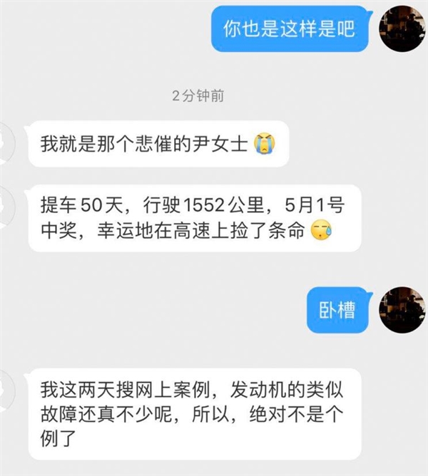 在车主“丞瑜CharmZ ”于微博上公开了此事之后,有其它车主联系他表示也出现了相同的”车辆故障“,甚至还有车主在高速路中出现了此种”故障“。