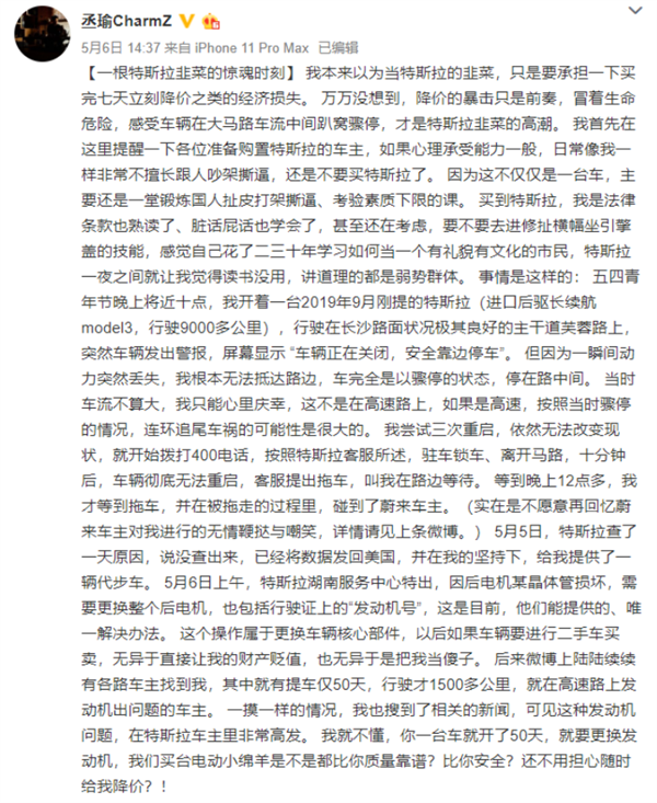 据国内媒体报道,5月6日,微博网友“丞瑜CharmZ ”发文《一根特斯拉韭菜的惊魂时刻》,其中称,自己在2019年9月份购买的一辆进口后驱长续航版Model 3,在行驶途中,突然出现失速骤停,造成严重的人身安全隐患。