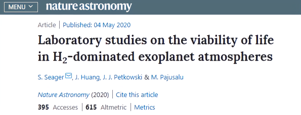 当地时间 2020 年 5 月 4 日, 该团队题为 Laboratory studies on the viability of life in H2-dominated exoplanet atmospheres(在以氢气为主的系外行星大气中生命生存能力的实验室研究)的论文在线发表于《自然·天文学》(Nature Astronomy)杂志。