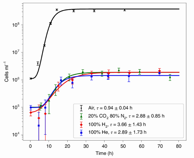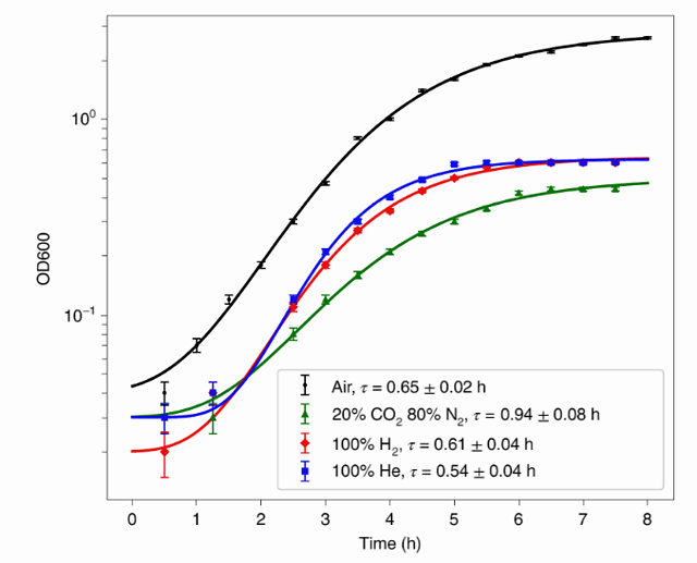 研究团队把大肠杆菌和酵母放在瓶子里,瓶子里分别装有纯氢气、纯氦气,以及 20% 二氧化碳和 80% 氮气的混合物(100% H2、100% He、20% CO2+80% N2),进行厌氧实验(另外还有一个瓶子作为对照,装了空气)。