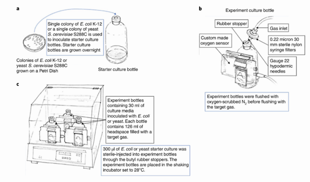 该团队设计了一个系统,该系统由具有 30ml 培养基(用于大肠杆菌和酵母细胞培养生长培养基的标准培养基)和顶部空间为 126ml 的小硼硅酸盐瓶组成。