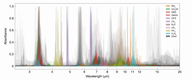 实际上,这一光谱也有着重要意义——在富含氢气的系外行星大气层中,上述很多气体可以作为可探测的生物标记,比如二甲基硫醚 C2H6S(图中的 DMS),这在某种程度上也能增加天文学家在系外行星识别到生命迹象的机会。