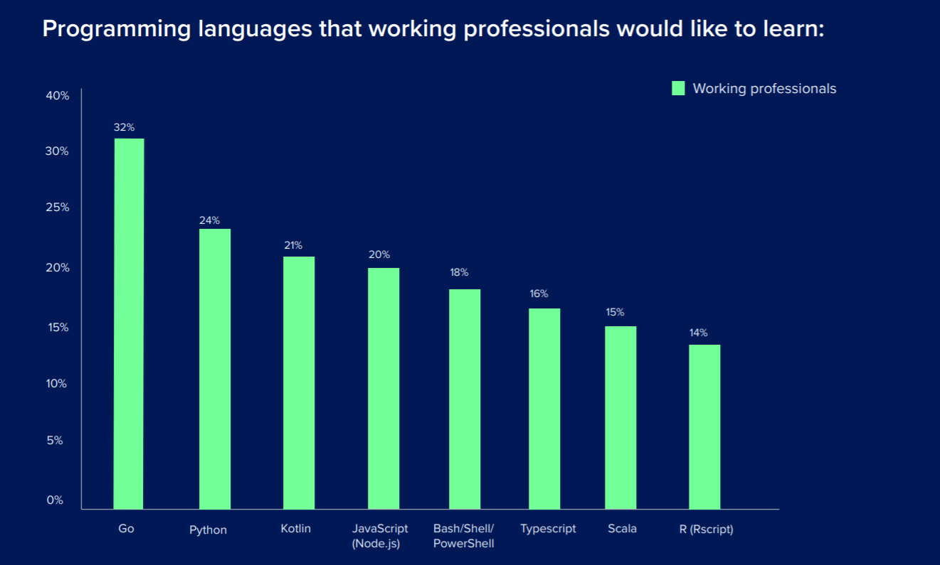 受访的学生最想学习的语言还有 JavaScript 和 Kotlin,而专业人士将 Python 和 Kotlin 作为接下来的选择。