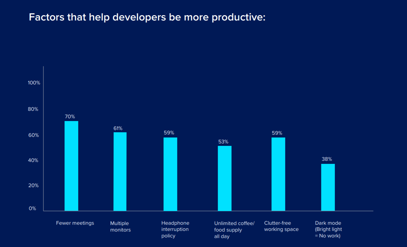 至于如何能够提高工作效率?70% 的开发者希望少开点儿会,61% 的受访者想拥有多台显示器,更加自由的工作氛围和空间、无限的咖啡和食物供应也都是大家所期冀的。