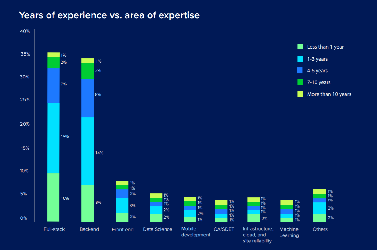 拥有全栈和后端经验的受访者最多(均超过 35%),其次是前端,但所占比例要低得多(不到 10%)。