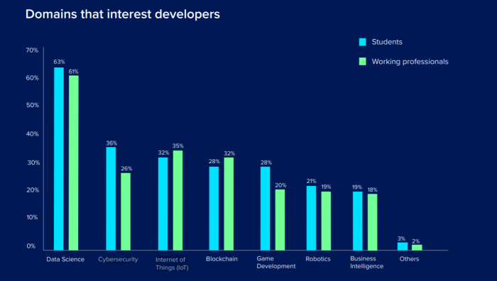 在最感兴趣的领域方面,数据科学当仁不让,并以超过第二名接近一倍的数据遥遥领先。网络安全和物联网领域分别是人们感兴趣的第二和第三名。区块链、游戏开发、机器人等等也占有一席之地。