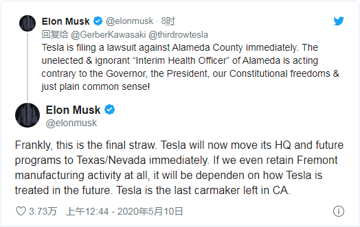尽管马斯克在努力重启工厂的运转,但加州和地方的行政矛盾还是让他纠结不已。在早些时候的推文中,马斯克对阿拉米达“临时健康办公室”展开了猛烈的抨击,称地方限制令违抗了州政府的意志。