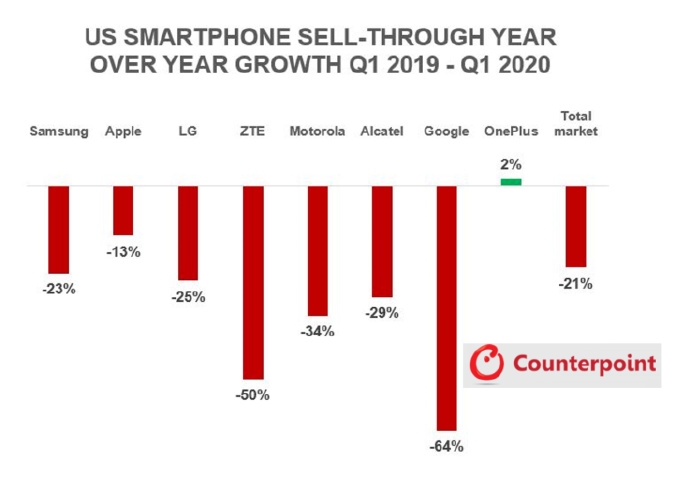 近日,知名数据统计公司CounterPoint发布了2020年第一季度美国智能手机市场统计,数据显示,受疫情影响,美国各大智能手机品牌销量全线亮红灯——除了一加。具体来说,2020年Q1美国几乎所有主要手机厂商都面临10%-20%左右的销量萎缩。