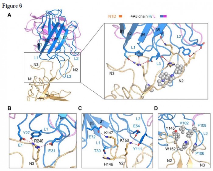 之后的结构分析发现,中和抗体4A8的可变区与其中的两个柔性片段(N2和N3)相互作用,因而稳定了该部分结构,交互界面由广泛的亲水相互作用网络构成。