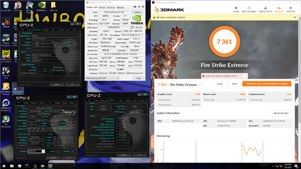 他使用了超频到5GHz的酷睿i9-10980XE处理器、华擎X299 OC Formula主板,在液氮环境下,将GTX 970超频到了1865MHz,显存频率也超到了2052MHz,最终在3DMark Fire Strike Exteme中拿到7361分,登顶第一。
