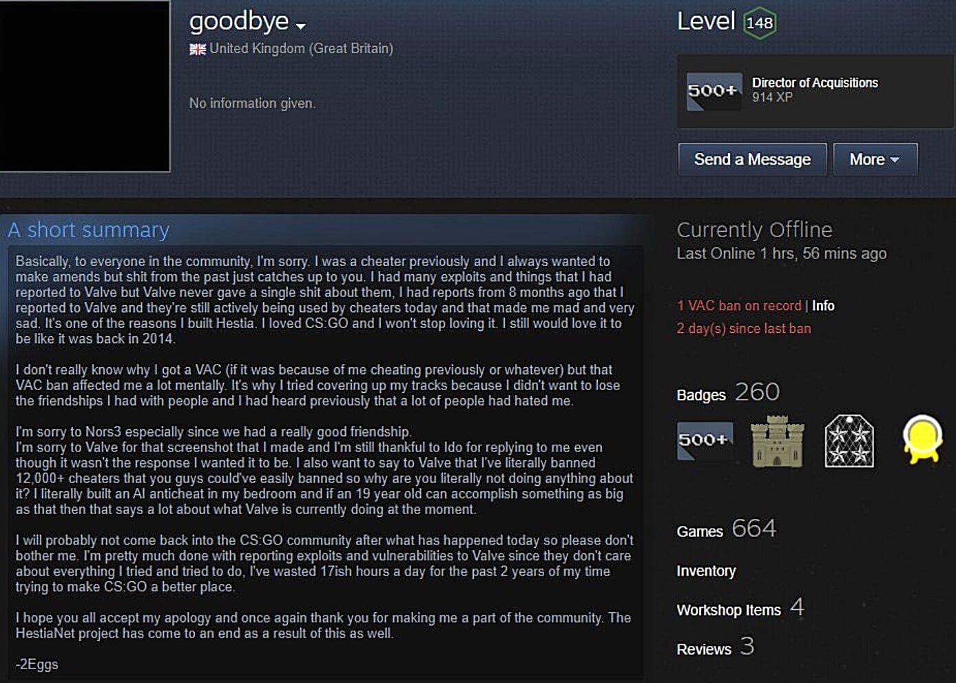 在被官方打脸后2Eggs已经删除了自己的推特账户,并在Steam发表长文表示永久退出《CSGO》圈。在文中2Eggs提到了自己对V社的怨恨(他上报了自己发现的海量漏洞,但到今天还有漏洞再被挂B利用),以及为何自己上头开挂被封后做出拙劣掩饰之举(不想失去《CSGO》社区的友谊)等等。最后他为发生这样令人遗憾的事道歉,表示退圈的同时HestiaNet反作弊项目也永久停止更新。