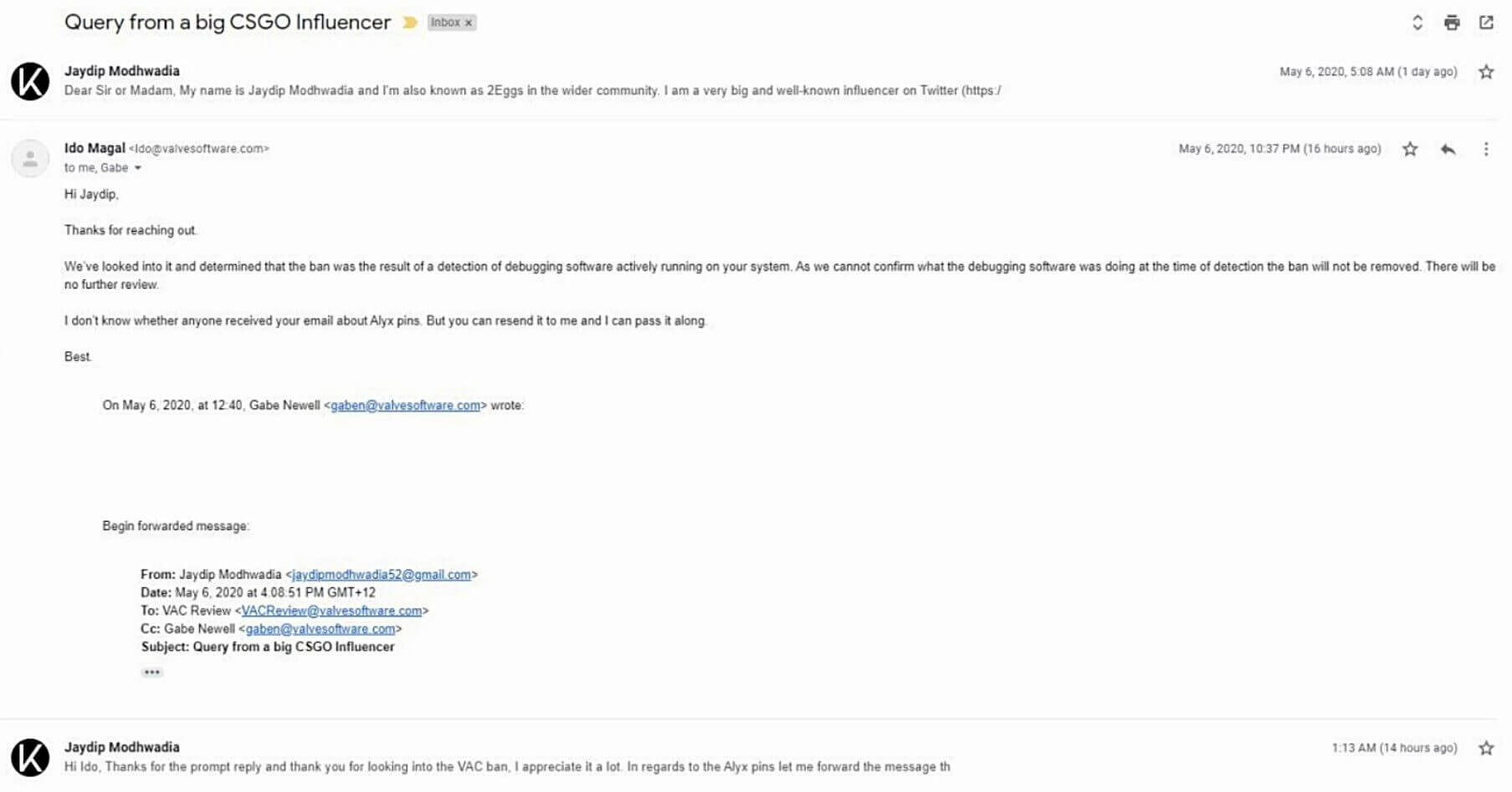 具体来说2Eggs在自己的Steam主页和推特,甚至他人沟通中,都谎称自己被误封,并且发表了经过篡改PS的客服问答邮件。在2Eggs提供的截图中官方称他可能由于运行调试程序而被封,但是在V社开发者Ido Magal提供的真实邮件中,只有官方确认其作弊的信息。