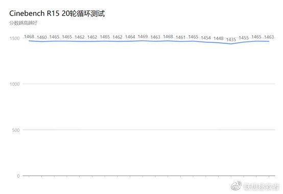 CineBench R15 20轮循环测试顺利通过,性能稳定,全程维持在最高成绩,波动极小,最大分差只有33分。
