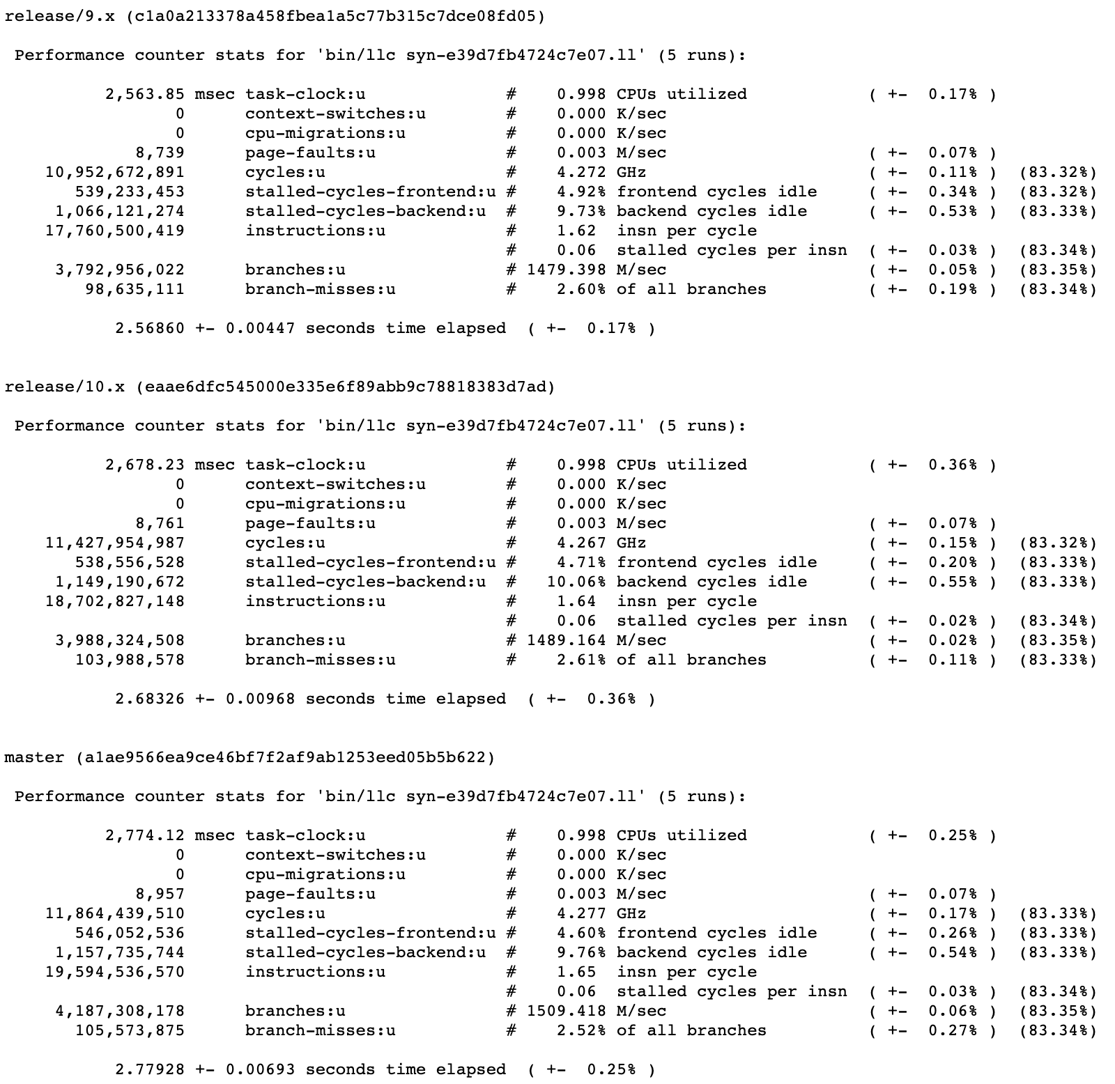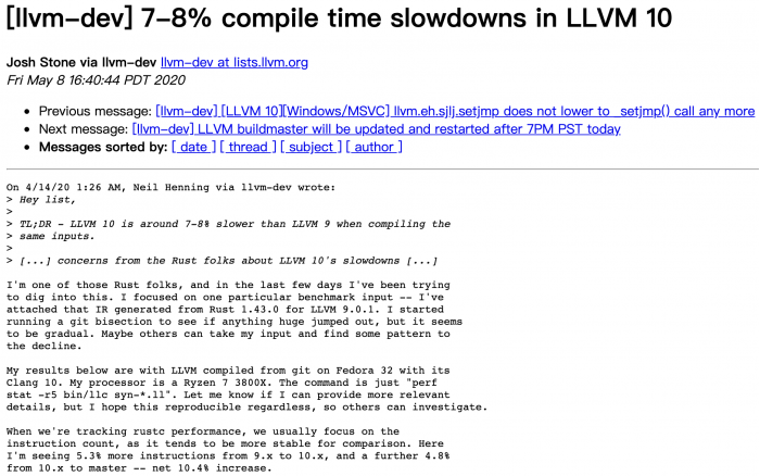 Josh 和其他开发者发现,与使用 LLVM 9.0 相比,LLVM 10.0 会导致 Rust 编译时间变慢 7~8%。在邮件列表的一个帖子中,他指出从 LLVM 9.x 到 10.x 在测试代码库上生成的指令大约多了 5.3%,而从 LLVM 10.x 到 LLVM 11 Git master 分支,此项数据又增加了 4.8%。