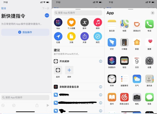 在玩转了自带的各种快捷指令之后,就可以尝试自己制作添加自己的快捷指令了。在快捷指令中添加新的快捷指令,可以与自己安装的APP进行配合,包括“通讯录”、“日历”、“闹钟”等系统应用,或者“微信”、“网易云”音乐这些第三方应用,通过功能的添加组合,让你能够一键直达,省去各种麻烦操作。