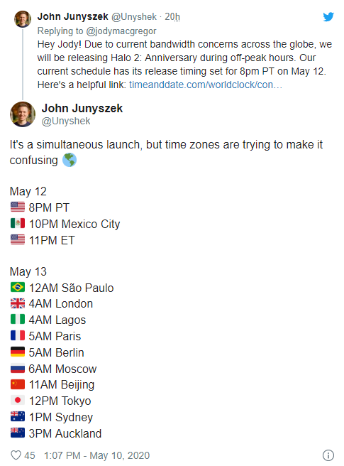 根据推特可以很清楚的看到《光环2周年纪念版》中国区(Steam以及Win10商城)解锁时间为5月12日北京时间上午11点。