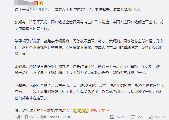 中国制造业的产值遥遥领先美国、欧洲、日本,不过部分行业还没有做到顶级水平,之前最容易被人质疑的就是圆珠笔的笔芯,因为这个钢材很特别,据说全球只有瑞士及日本公司能生产。没想到,瑞士这家公司还是破产了,因为中国公司已经攻克了圆珠笔芯钢材制造技术,导致价格急剧下滑,他们没有优势了,愤而在WTO发起诉讼,要起诉中国。这个事日前又在微博上热炒起来了,不少帐号都发了这个事,引来了网友大量转发、评论。