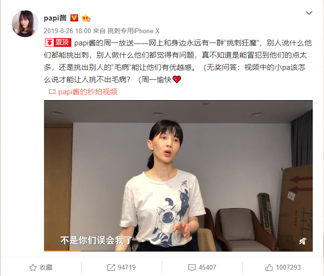 对此,papi酱并未正面回应,而是置顶了去年8月的的一段吐槽视频,主题是:网上和身边永远有一群“挑刺狂魔”,别人说什么他们都能挑出刺,别人做什么他们都觉得有问题,真不知道是能冒犯到他们的点太多,还是挑出别人的“毛病”能让他们有优越感。