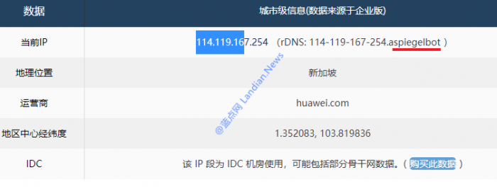 经过搜索蓝点网发现这个爬虫属于华为旗下的Aspiegel公司,该公司位于爱尔兰都柏林,负责华为移动服务(HMS)国际版的运营。