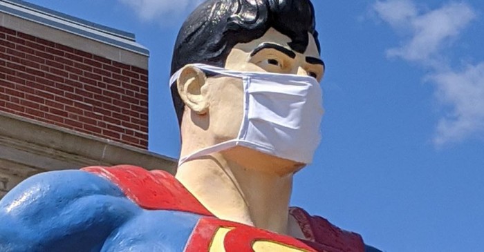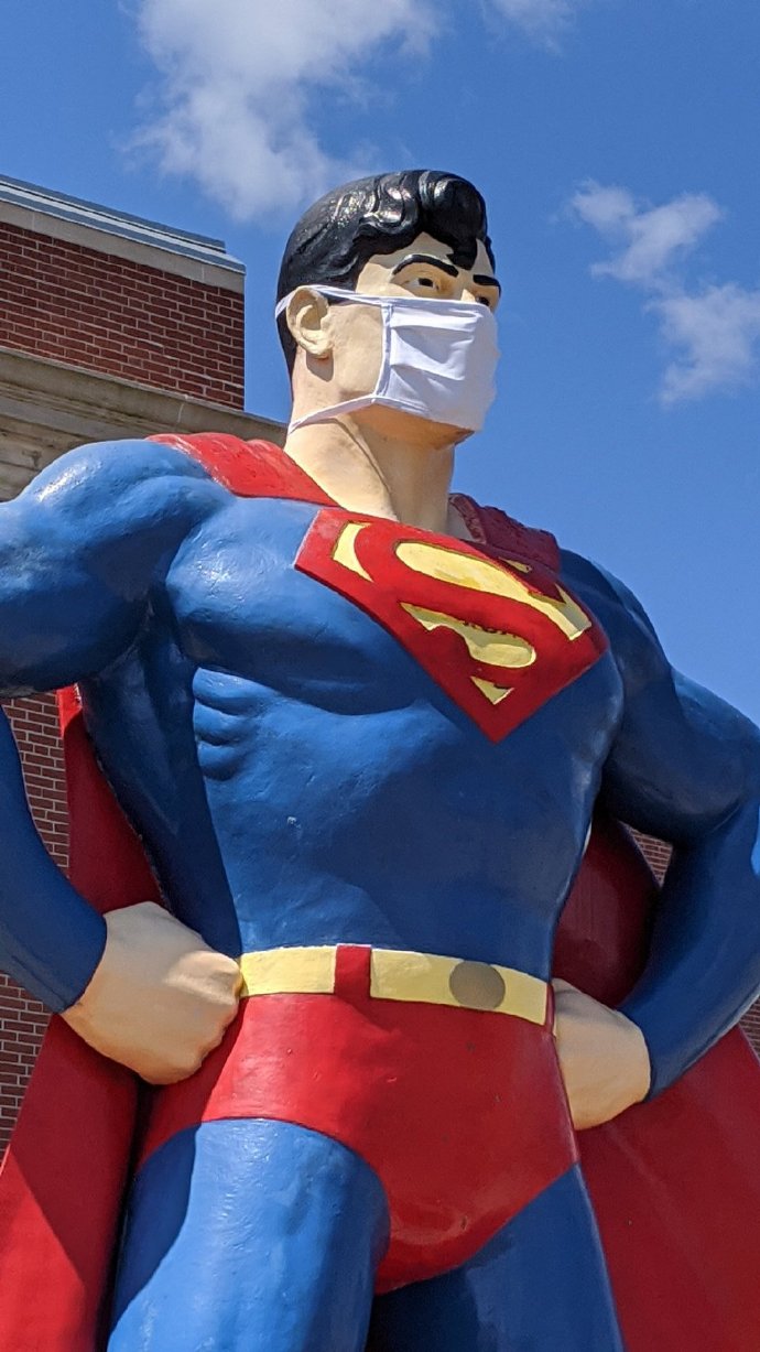 美国伊利诺伊州梅特罗波利斯市为当地标志性的巨大超人雕像戴上了口罩,向疫情期间维持城市运转的重要工作者们致敬!当地还坐落着著名的超人博物馆,拥有超过7万件收藏品,包括多年来各种超人影视剧的道具。