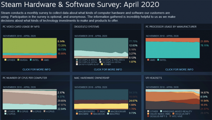 在Steam日前公布的4月度硬件统计中,AMD处理器再度观察到增加,从19%提高到了22%,当然,Intel依然独领78%风骚。从核心数来看,游戏玩家最多配置的是4核处理器。显卡方面,GTX 1060是保有量最大的显卡,其次是GTX 1050 Ti。高端显卡中,数量最多的是GTX 1080。