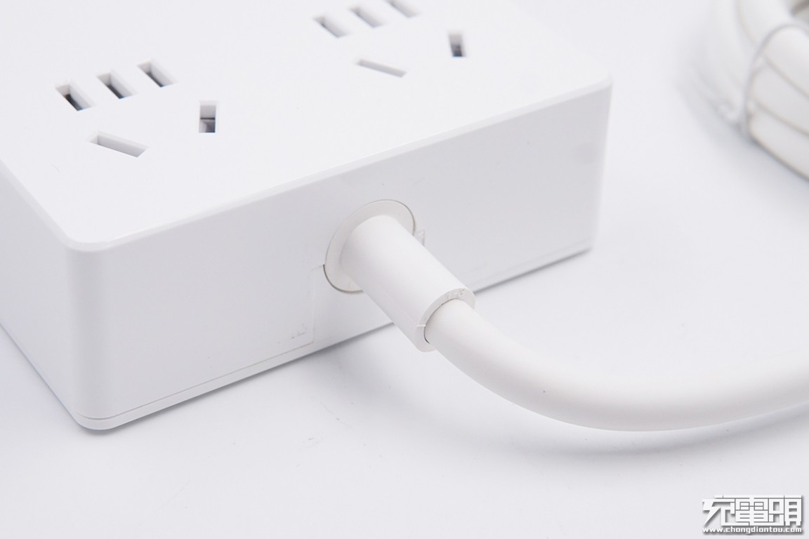 插线板入线口处采用了胶套卡子保护线材,弯折使用时可以避免线材外皮破裂,也可以避免拉扯脱出。