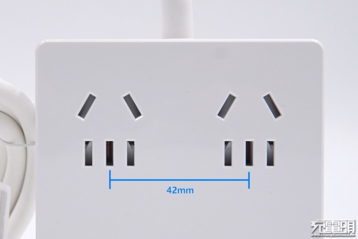 得力45W PD插线板拥有两个AC插孔,孔距为42mm大孔距,方便日常插头、电源适配器使用。插孔类型为新国标2+3组合插孔,每个孔位都做了倒角处理方便插头插入。还可以看到孔位内均带有一块挡板,这是新国标插线板规定中新增的 “安全门”。