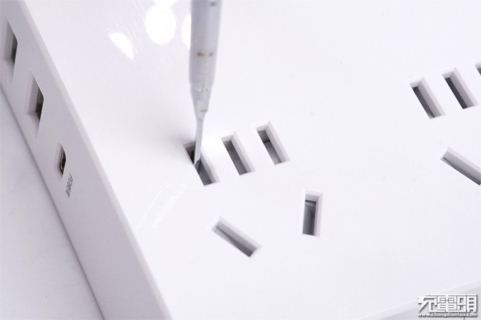 近距离拍摄插孔内部,每个插孔都带有安全门设计,实测金属棒插入插孔被会安全门阻挡。安全门具备单边插入锁死功能,能防止75N以下力单极插入,可以有效避免异物误插造成触电危险,对家里有小孩的使用环境安全门是十分关键的一环。