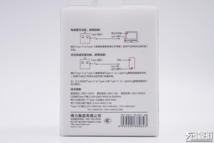 包装背面是产品信息部分,上半部分是使用说明,支持为笔记本电脑提供PD充电、支持苹果、安卓用户快速充电。