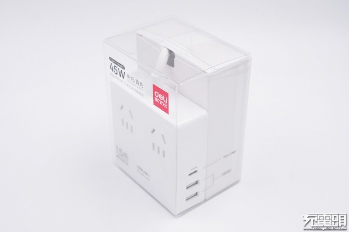 得力45W PD插线板外包装是全透明塑胶板折叠而成,右上角大红色“deli得力办公”商标,左边是产品特色介绍,支持45W Type-C 输出,快充/直充功能支持手机与笔记本电脑使用。