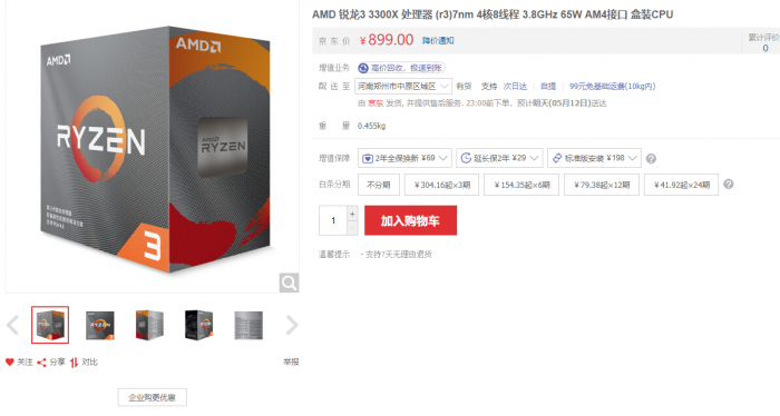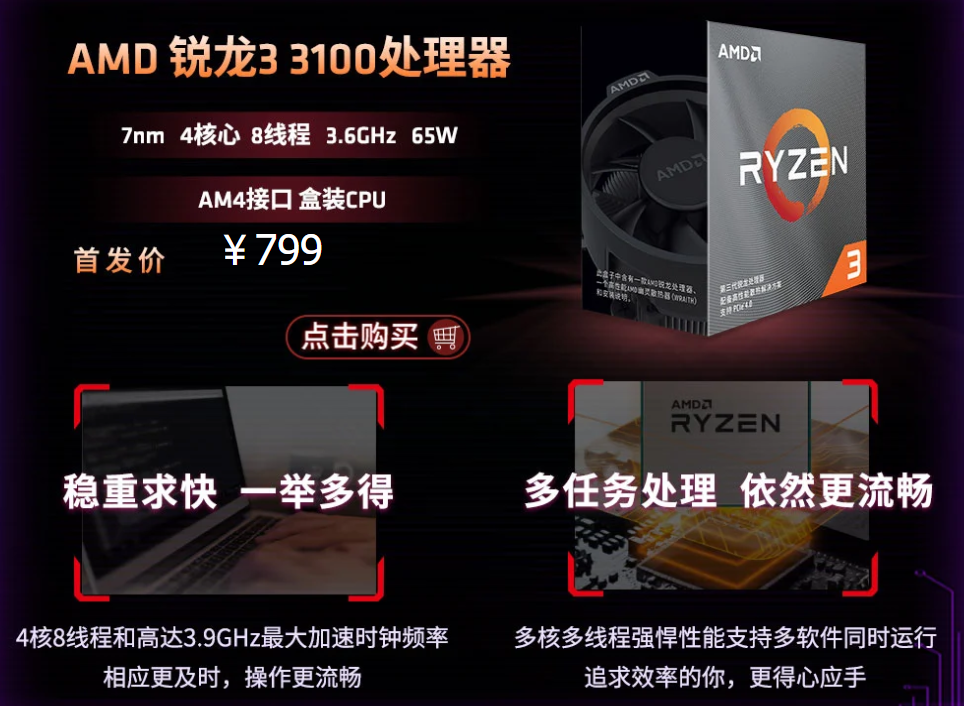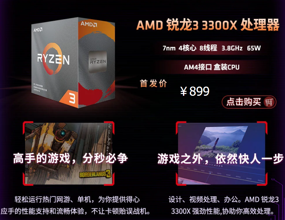 5月11日晚,AMD第三代桌面锐龙家族的两名入门级新成员锐龙3 3300X、锐龙3 3100正式上架开卖,定价分别为899元、799元。锐龙3 3300X、锐龙3 3100均基于最新的7nm工艺、Zen2架构,在锐龙3系列中首次开启多线程技术,二者均为4核心8线程,频率前者3.8-4.2GHz,后者降至3.6-3.9GHz。