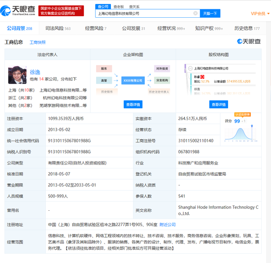上海幻电信息科技有限公司成立于2013年5月,法定代表人为徐逸,注册资本约为1099万人民币,经营范围包括信息科技、计算机软硬件、网络工程领域内的技术转让、技术咨询、技术服务,商务信息咨询,企业形象策划,玩具、服装的销售,广播电视节目制作等。
