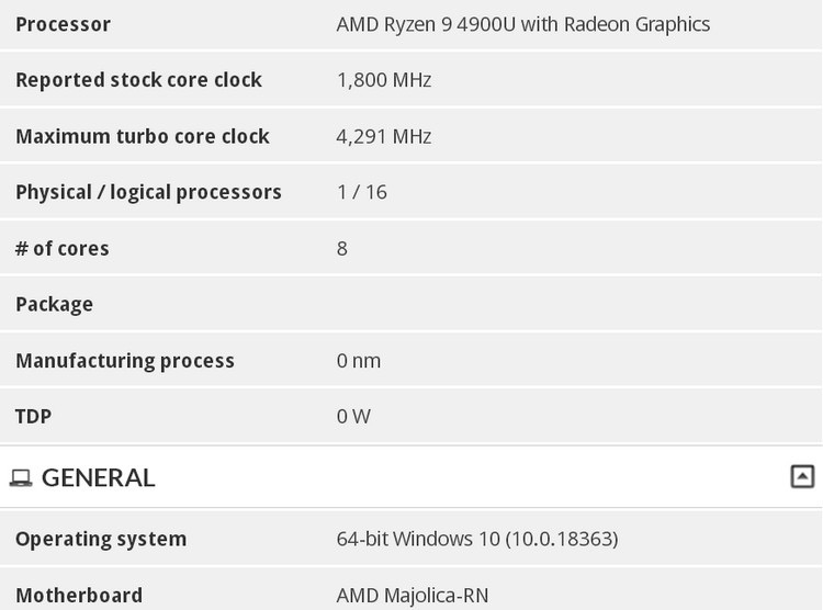 根据网站信息显示,锐龙9 4900U依然采用了8核16线程设计,基础频率与4800U保持一致均是1.8GHz,加速频率则高出100MHz,达到4.3GHz,其他参数尚不清楚。
