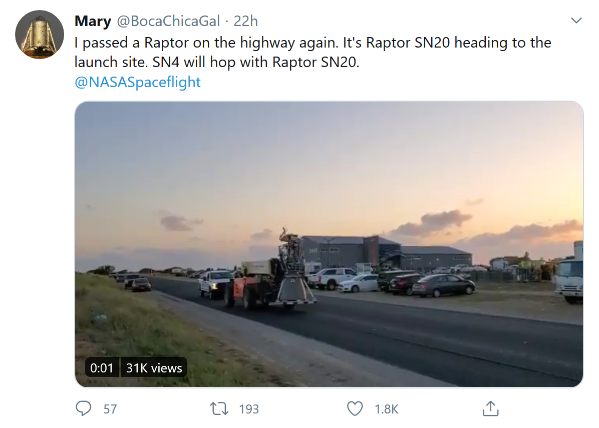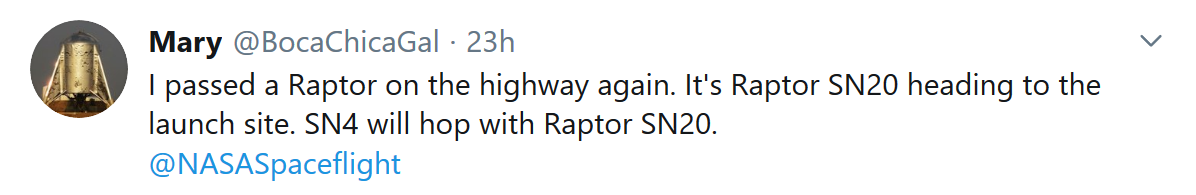 目前还不清楚这艘更大的星际飞船原型什么时候能最终展开测试,但在德克萨斯州博卡奇卡的SpaceX测试设施附近,目击者发现SN4的Raptor引擎在测试点火后被移除并更换了一个不同的引擎。