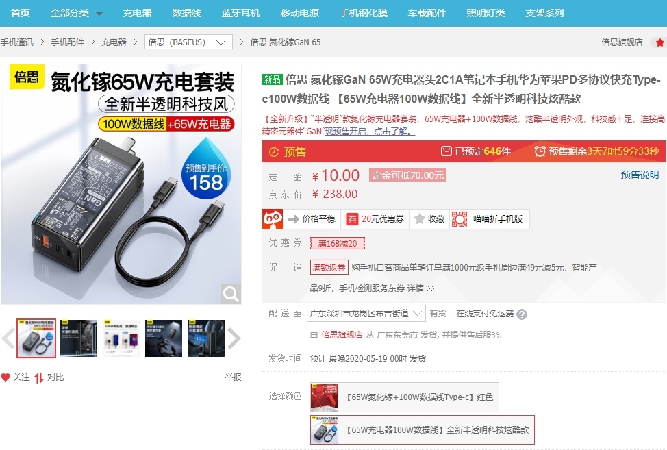 这么酷炫的倍思透明快充探索版氮化镓充电器现已在京东开启预售,定价为238元,5月19日正式发货。当前预售期间10元定金可抵70元,最终到手价158元,并且套装内还包含一根5A E-marker 100W USB-C to USB-C线材,性价比十分高。