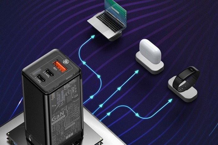 相比起普通充电器只能充一个产品,倍思透明探索版氮化镓充电器拥有三个输出口,分别是两个USB-C PD快充输出口,一个USB-A快充输出口。支持同时为三台设备进行供电,最大输出功率65W,外出时一个充电器即可满足大部分用户需求。