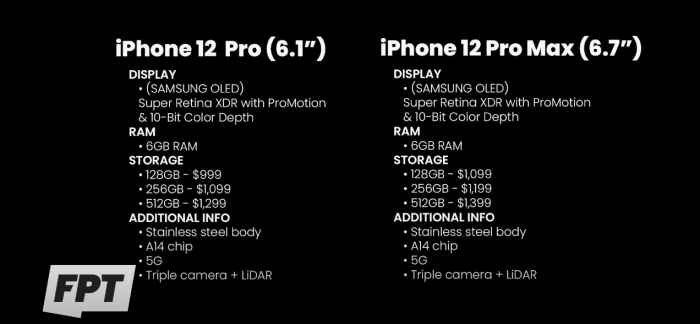 内存升级为 6GB,iPhone 12 Pro 128/256/512GB 售价分别为 999/1099/1299 美元,iPhone 12 Pro Max 则为 1099/1199/1399 美元。