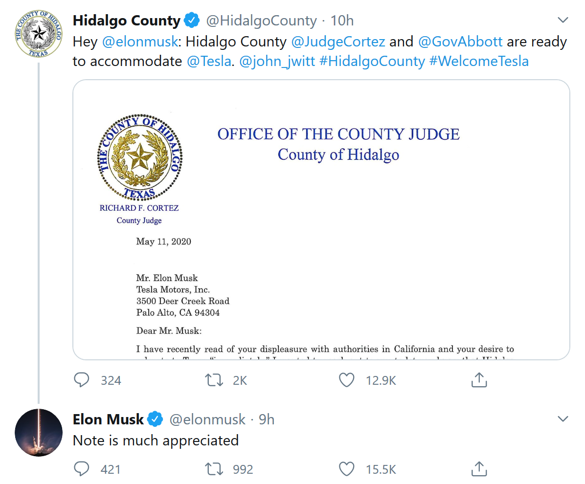北京时间12日消息,在马斯克威胁要将特斯拉美国唯一工厂从加州弗里蒙特迁往其他州以后,德克萨斯州一个县立刻表示希望接纳特斯拉的工厂。马斯克发推称,他“非常感谢”该县提出的这一建议。德州伊达尔戈县(Hidalgo County)法官理查德-科尔特兹(Richard Cortez)在一封信中写道,该县有一支劳动力大军,可以很快接受培训,并开始为特斯拉生产汽车。