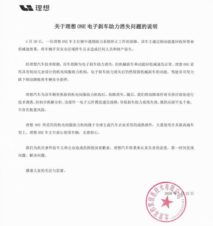 5月12日,理想汽车发布关于一辆理想ONE发生刹车助力消失问题的说明。经技术调查发现,故障是由于制动系统中提供助力的机电伺服助力机构故障引起的:该部件一电子元件偶发通信故障,导致刹车助力系统失效,属供应商罕见个案,不存在批量风险。官方发布的说明全文如下: