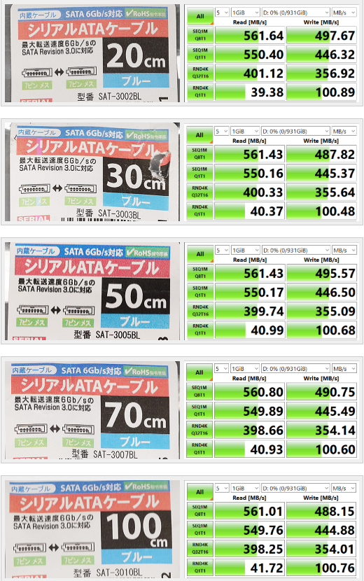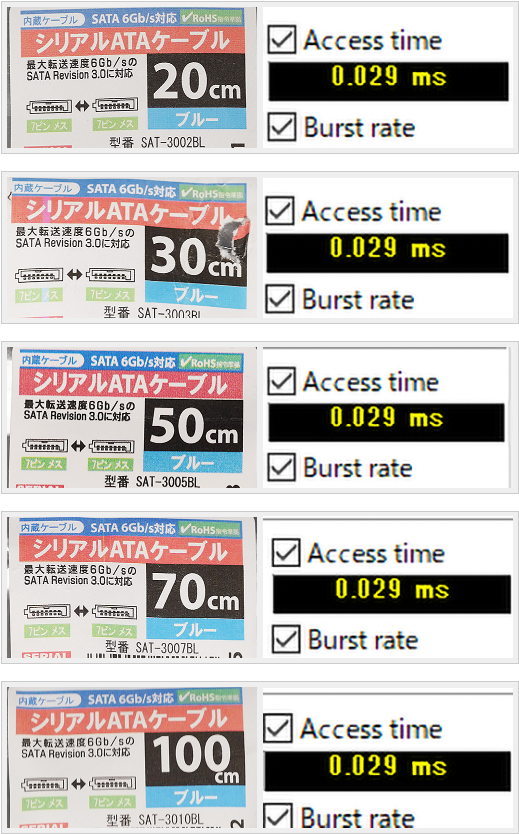 日本akiba-pc网站还真的测试了SATA先长度对性能的影响,他们找了20cm、30cm、50cm、70cm及100cm五种不同的SATA线,最长的是最短的5倍,几乎是日常能用到的SATA线的极限了。
