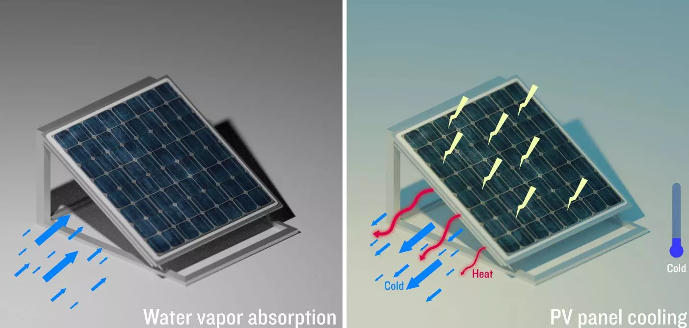 在夜间,氯化钙(一种强大的干燥剂)会将水蒸气从潮湿的空气中吸引出来,进入凝胶中,在那里以液体的形式储存起来。这种凝胶在吸水时膨胀,有可能使其干重增加一倍。在白天,碳纳米管会吸收太阳能电池板的热量。一旦有足够的热量传入凝胶中,储存的水就会变热,变成水蒸气。然后它就会从凝胶中蒸发出来,将热量带走。