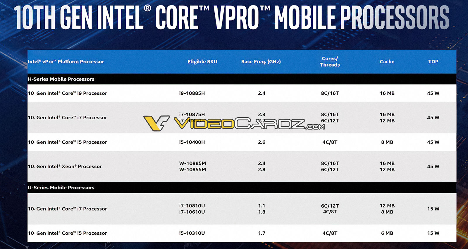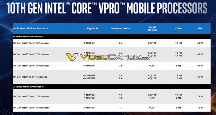 实际上,Comet Lake-H的产品线是经过了变更的,原本有一颗Core i9-10880H被下放到Core i7系列中,成为了Core i7-10875H这颗有8核16线程的处理器,而同时在Core i9系列中新增了一颗支持vPro的Core i9-10885H处理器。