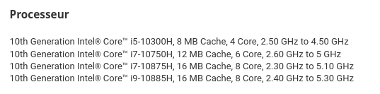 这款Core i9-10885H暂时还没有在任何产品中出现,除了DELL即将要发布的XPS 15/17,下面这张可选CPU型号图就是来自于Dell法国的偷跑。在宣传中,新的XPS 15和XPS 17最高都可选配Core i9,而这Core i9,应该就是暂时还没发布的Core i9-10885H。