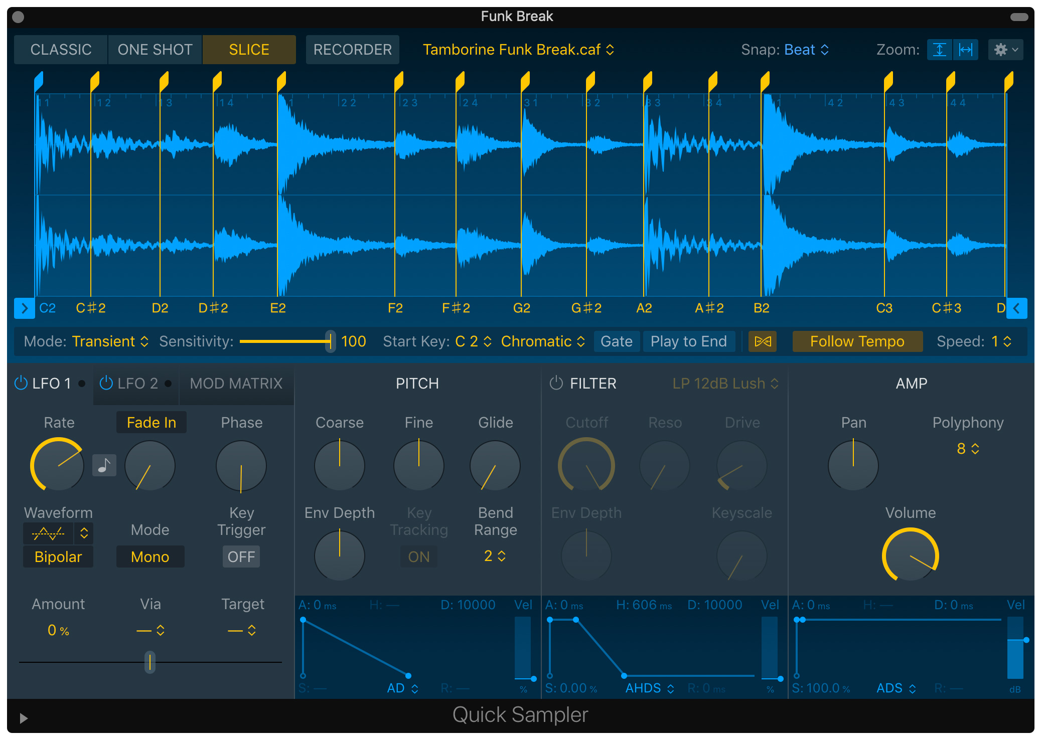 Quick Sampler 提供一种快速简单的方式,将任何单个声音变成可演奏的乐器。音乐人可从 Logic、访达、语音备忘录内选取声音,甚至可直接录音至 Quick Sampler。只需点按几下,便可跨键盘控制器对导入的样本进行修剪、循环和播放,并可取用富有创意的声音塑造控制选项。