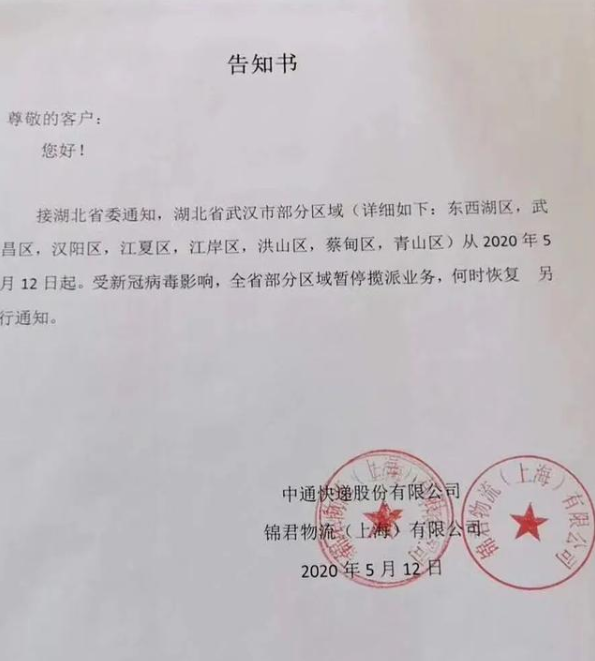 5月12日,一份告知书在网上流传,称从5月12日起,受新冠病毒影响,中通快递武汉市部分区域暂停揽派业务。对此,今日零时,湖北中通回应称,此为第三方物流公司假借中通名义造谣,为不实信息。中通快递湖北省管理中心对此予以强烈谴责,并将依法追究相关单位和责任人的法律责任。